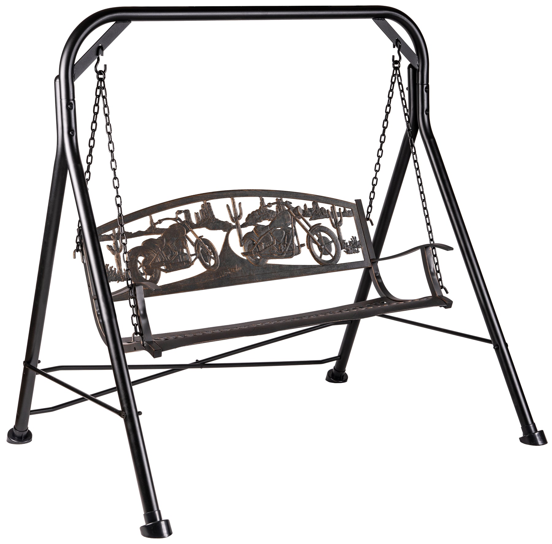 Rev up your outdoor space with the Cast Iron Motorcycle Swing, featuring two detailed motorcycles in a desert highway scene. Perfect for motorcycle enthusiasts, this biker-themed outdoor bench adds rugged personality to your patio, garage, workshop, man cave, or even your garden.