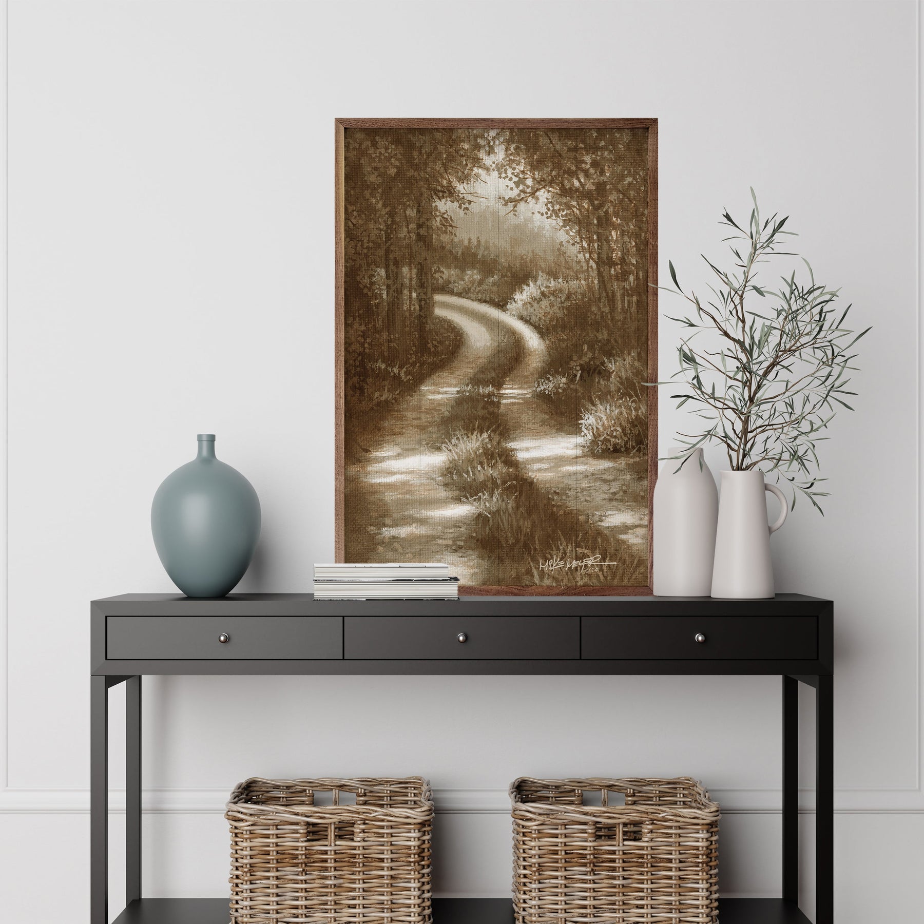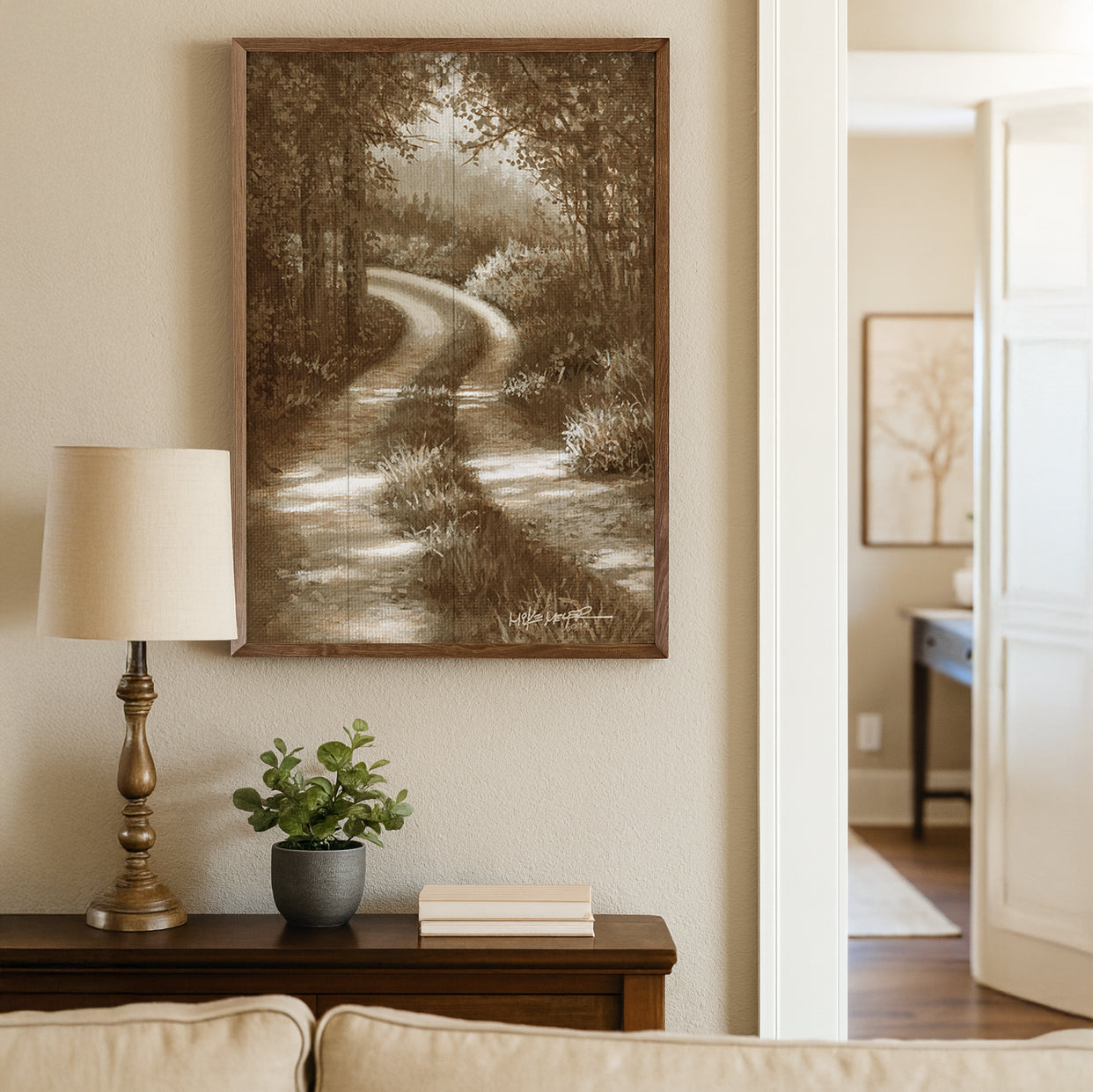 Bring this peaceful country road to your home with the framed Sun Drenched Road landscape wood print, a nature-inspired piece of wall art designed to complement Painted Sky furniture. Originally hand-painted by founder and wildlife artist Mike Meyer in acrylics, this artwork features a country road meandering through a wooded canopy of trees.