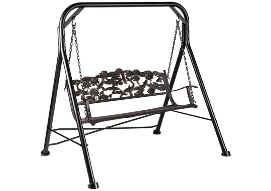 The Koi Swing brings a serene, artistic touch to any garden, patio, or outdoor retreat. Designed by a wildlife artist, this beautifully crafted swing features a school of koi swimming among lily pads, creating a tranquil, nature-inspired scene. Built with a sturdy tube steel frame and an artist-designed cast iron back and seat, it hangs securely from powder-coated steel chains for smooth, relaxing motion. The bronze powder-coated finish with hand-painted gold highlights ensures durability and maintenance-free beauty.